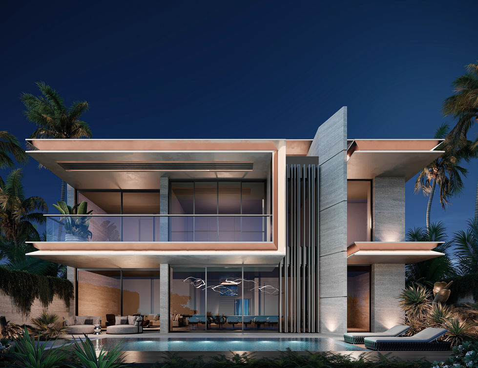 This project presents the design of a luxury villa in Sobha Hartland, Dubai, emphasizing modern elegance and high-end living. The villa features a clean, linear form with expansive glass windows that flood the interiors with natural light while providing seamless connections to